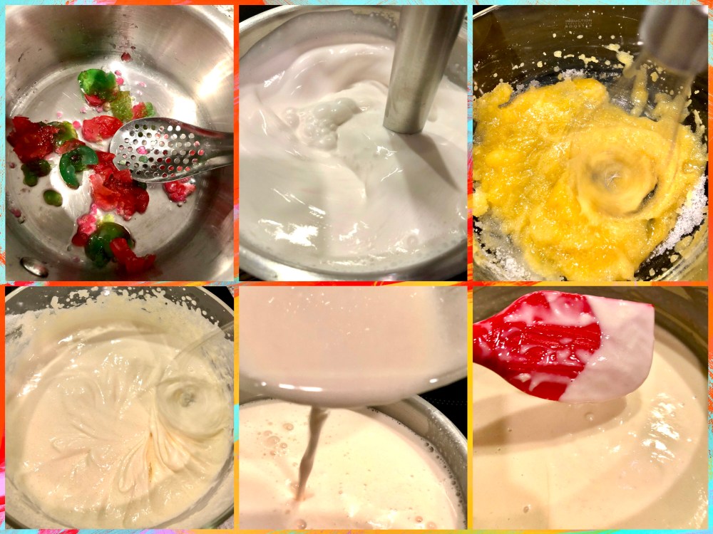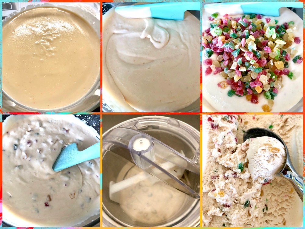 - Sacar del frío y montar con varillas 2 ó 3 min., echarle las frutas confitadas, mezclar bien con movimientos envolventes y ponerla en la cubeta de la máquina heladora, programar 35 ó 40 min., el tiempo dependerá de la potencia de la misma y lo fría que esté la crema.