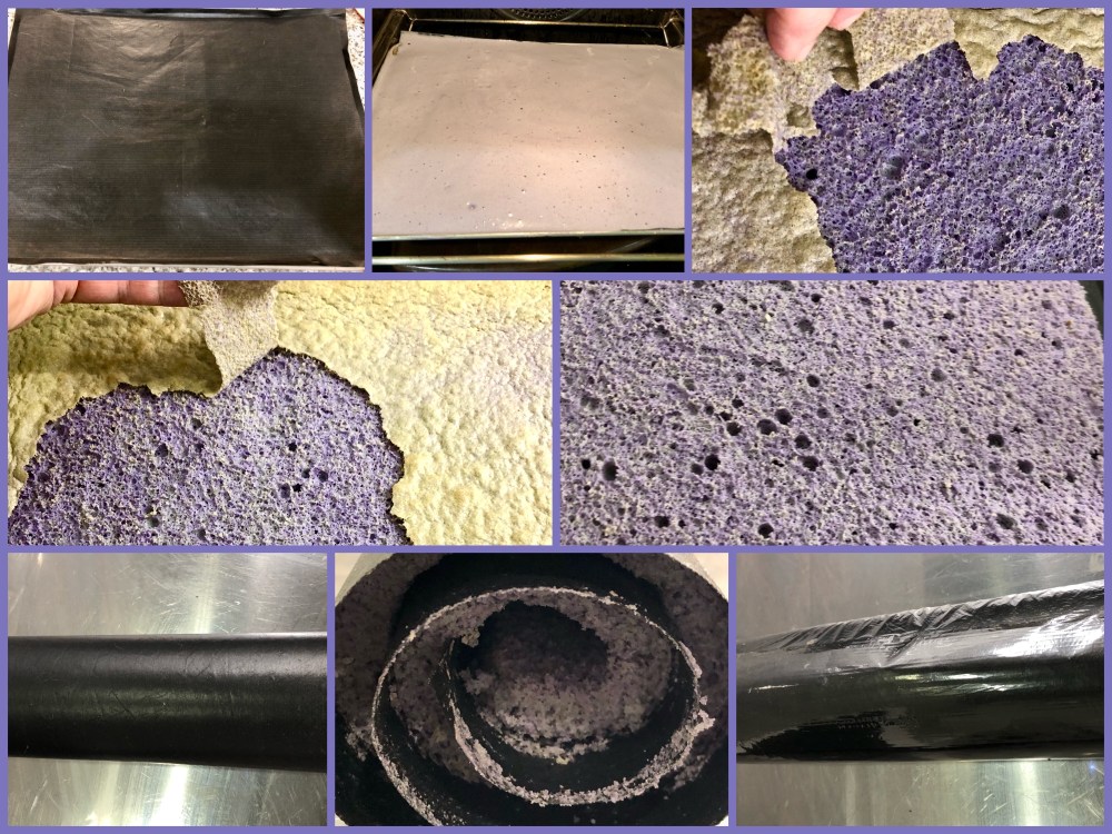 - Preparar una bandeja para hornear, con una lámina antiadherente en la base. Verter la masa sobre la lámina y extenderla de manera uniforme. Ayudarse de una espátula si es necesario. Debe quedar distribuida de manera uniforme. Precalentar el horno a 190°, hornear de 6 a 8 minutos. Vigilándola, se hornea rápidamente y se podría secar. Debe quedar cocida pero húmeda y parecida a una esponja.