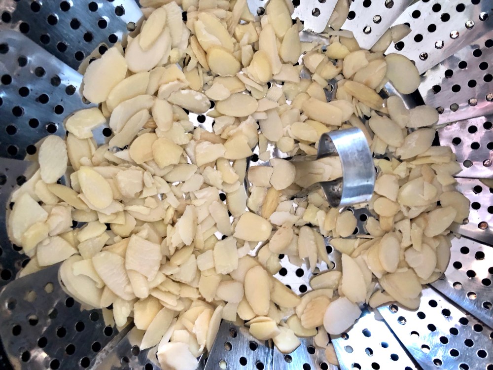 - Poner en el cesto de la freidora 50 g de almendra cruda laminada.