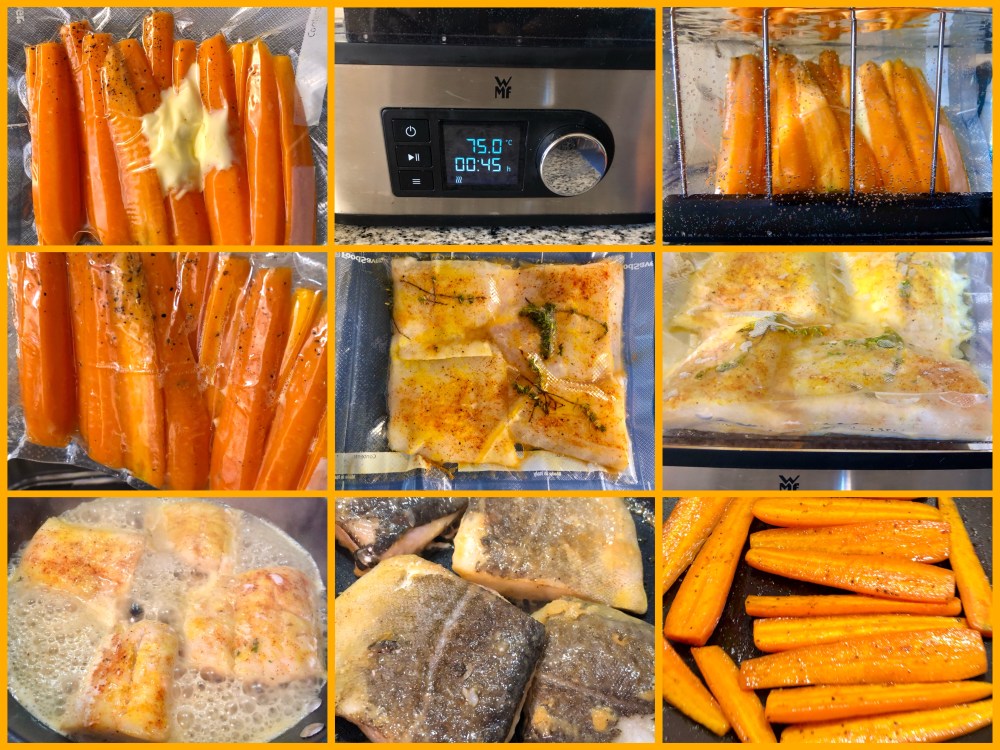 - Poner agua en la máquina de baja temperatura y programar a 80º durante 30 min. Mientras se calienta el agua, ir pelando las zanahorias y partiéndolas por la mitad. Meterlas en la bolsa del vacío junto con un poco de sal, pimienta y mantequilla. Sellar la bolsa y sumergirla en el agua. El tiempo comenzará a contar cuando haya alcanzado la temperatura.