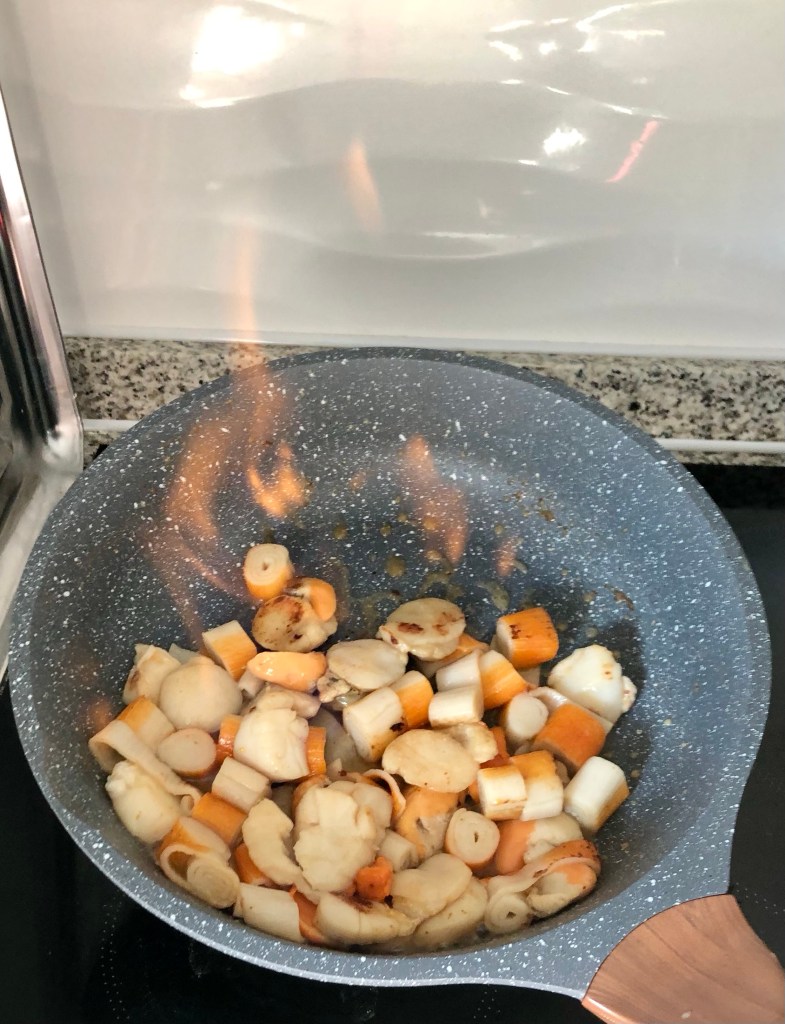 - Echar 1 cucharadita del aceite en una sartén, llevarla al fuego y una vez caliente echar las vieiras y darles vueltas haciendo movimientos con la sartén en el aire, añadir los troncos de mar y repetir, rociar con el brandy y prender para frambear, dejar hasta consumirse el alcohol. Sacar el marisco y reservar.