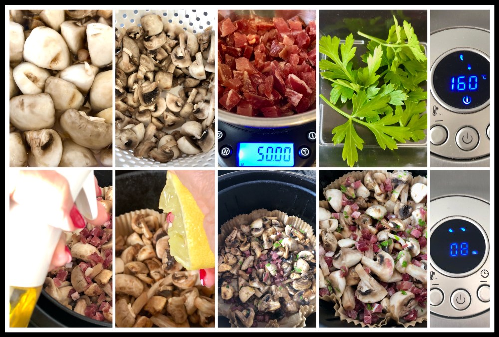 - Poner en el cesto o en las parrillas según el modelo de freidora que tengamos, el o los platos y echar en ellos los champiñones, jamón, perejil picado, pulverizar 3 veces con aceite y rociar con un poco de limón.