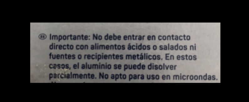 - Es importante saber que aún siendo para cocinar nos es recomendable que no entre en contacto directo con ácidos, como por ejemplo: limón, sal, vinagre etc., se puede descomponer pasando el aluminio a los alimentos y a su vez al ingerirlos a nuestro organismo.