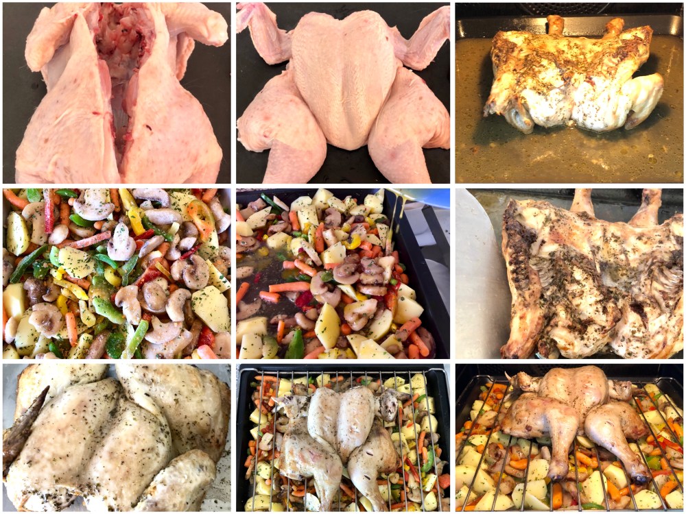 - Sacar de frigorífico la guarnición macerada, echarla en la bandeja dónde se empezó hacer el pollo, extenderla bien y si fuera necesario añadirles un poco de agua, no debe quedar seca, colocar encima la rejilla con el pollo y pincharle los muslos y pechugas, llevar todo junto de nuevo al horno 30 o 40 min., a la misma temperatura.