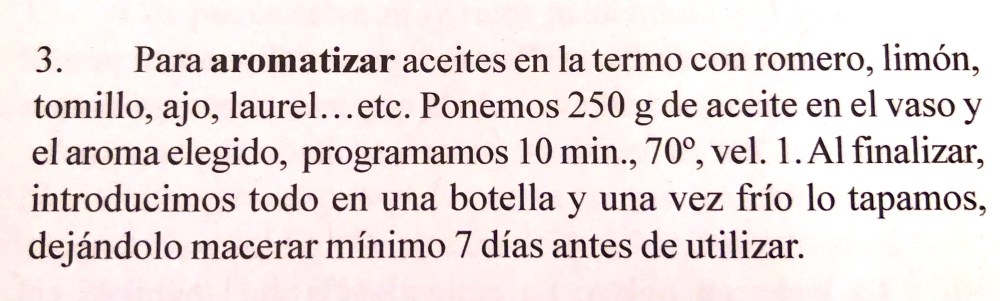 - En esta ocasión solo hice 200 g de aceite, con 2 cayenas cerradas sin romper, una rama de romero lavada y seca, 1 ajo mediano cortado en trozos y sin el tallo central, todo ello puesto en el vaso del robot y en velocidad cuchara. Si tenéis un robot que tenga una opción de no mover las cuchillas, utilizar esa función, y en caso contrario, utilizar la velocidad más baja posible para no romper y tratar con cuidado los ingredientes. Programar 7 min., 70º.