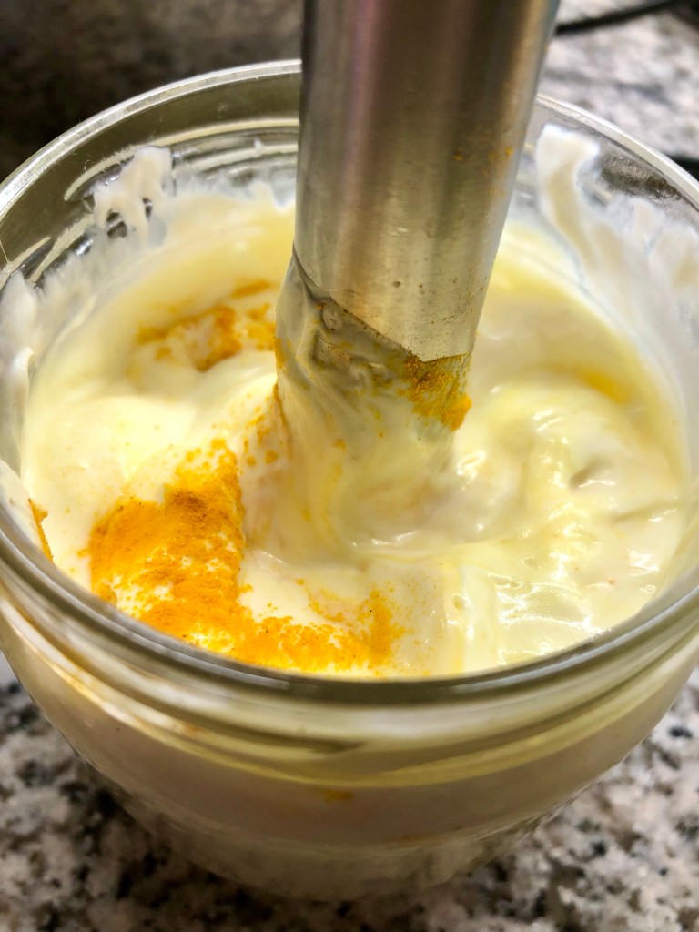 - En ese punto, levantar y bajar la batidora lentamente para que se incorpore todo el aceite. Antes de terminar, añadir la cúrcuma y batir un poco más hasta que se integre.