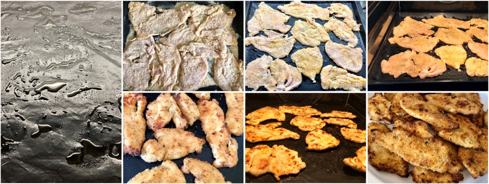 Una forma diferente de hacer filetes de pollo empanados, con menos aceite. Algunas personas opinarán que no quedan como fritos, pero el resultado es bueno y con menos grasa, solo hay que cogerles el punto, y dejarlos jugosos por dentro y crujientes por fuera.