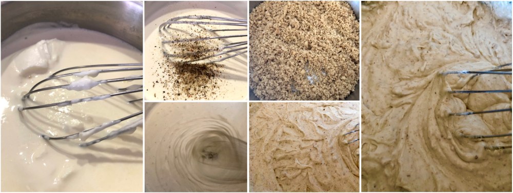 - Una vez fría, montar con varillas, cuando empiece a coger cuerpo agregar las nueces poco a poco y seguir montando, casi al final añadir el estabilizante o la gelatina. Batir hasta integrar y terminar de montar. En la última foto está terminada, el proceso dura 10 ó 15 min.