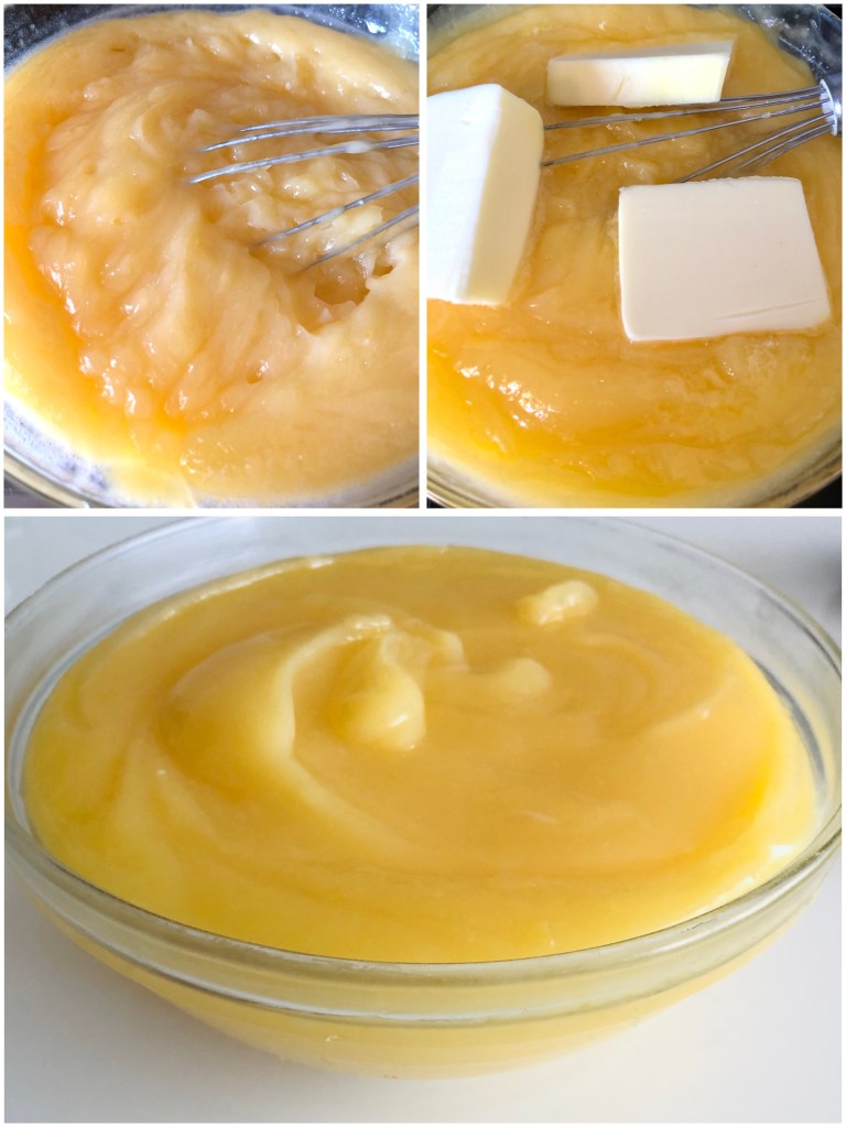 - Añadir la mantequilla en trozos, como muestra la foto 2ª, mezclar enérgicamente con varillas hasta obtener una crema brillante y suave.