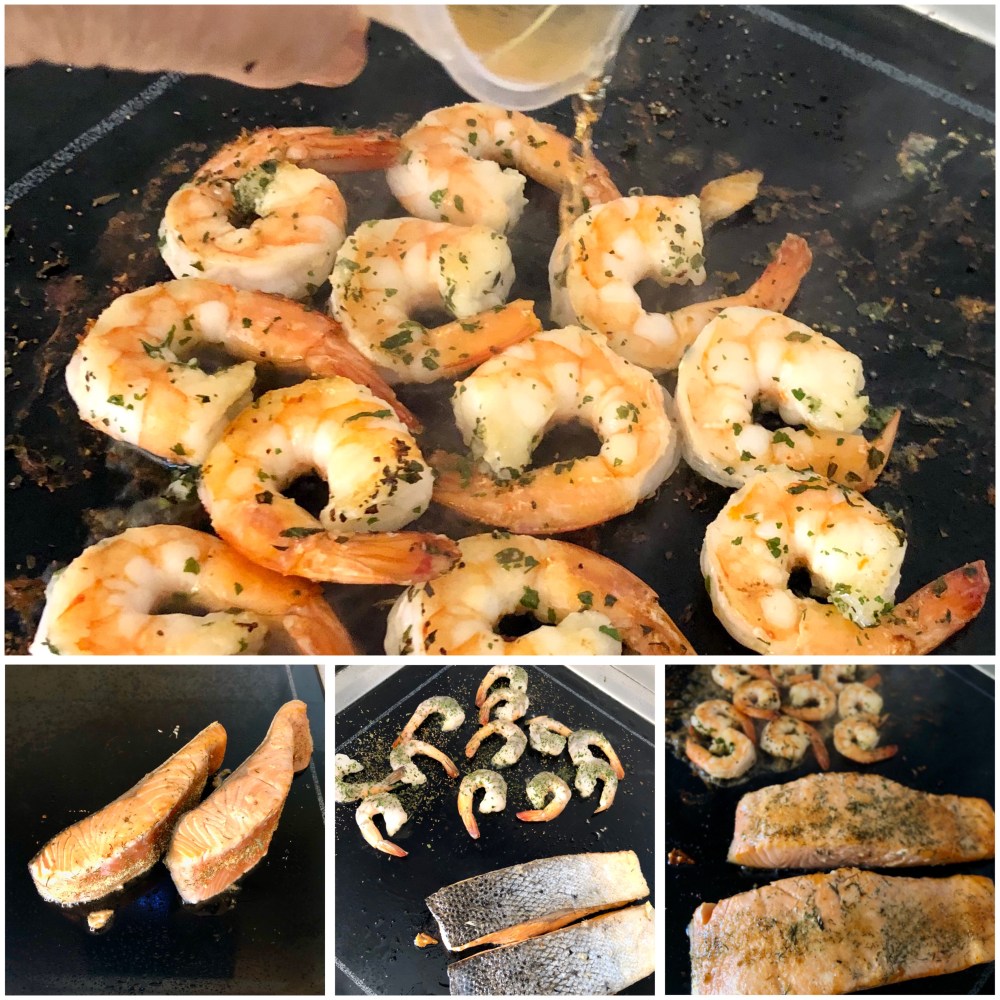 - Darle la vuelta al salmón y dejarlo con la piel para arriba, 1 o 2 minutos; en ese momento echar a un lado de la plancha los langostinos, dejarlos 1 minuto.