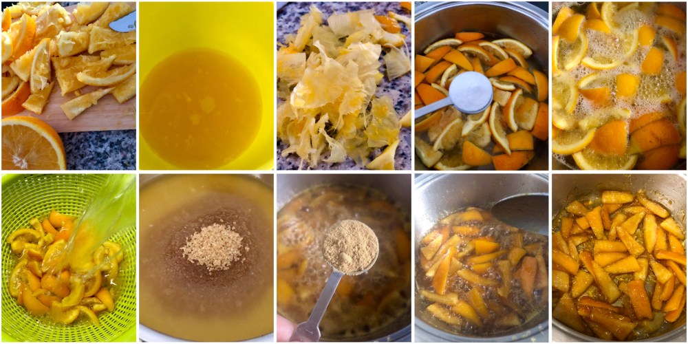 - Preparar las Naranjas: Una vez partidas por la mitad, exprimir el zumo y reservarlo, cortarlas en triángulos, recortando el exceso de piel y deshecharlos, dejando la cáscara con pulpa.
