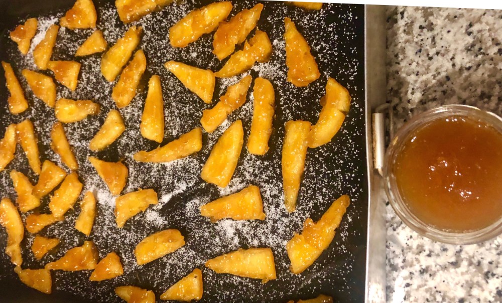 - Secado: Extender sobre una lámina antiadherente los trozos de naranja. Espolvorear con un poco de azúcar blanca, dejarlos secar en un lugar cálido de 1 a 3 días, incluso más; el tiempo depende de la cantidad, el grosor y la humedad del lugar. Importante no secarlos en exceso; deben quedar jugosos. Hoy los hice de dos formas: en 32 horas de secado los de la foto de abajo y en 48 horas los de la foto de portada. Si os fijáis bien, veréis la diferencia; los dos son ricos, pero diferentes, elegir el punto en función al gusto, tiempo de consumo y usos.