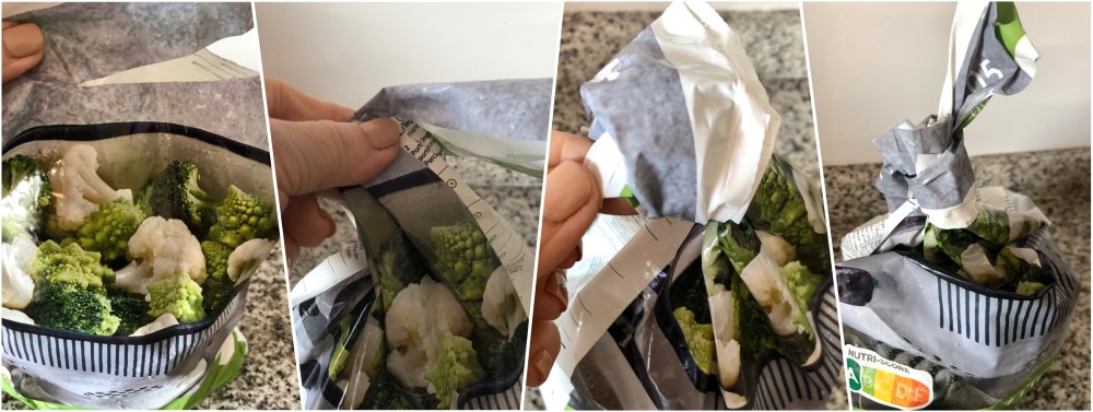 - Cuando tengo en el congelador bolsas grandes de alimentos, en lugar de usar pinzas, o gomas, hago una gran apertura a tres dedos de la parte de arriba de la bolsa (si es muy fino se puede romper). Uso lo que necesito ese día, y doblo la abertura haciendo unos pliegues, giro la parte cortada alrededor del pliegue y le hago un nudo para cerrarla. Es muy práctico, ahorra tiempo y se mantienen los envases hasta el final del producto.