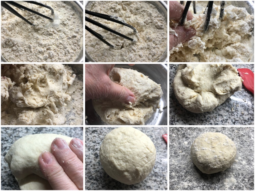 - Poner la nata y la harina en un recipiente, mezclar con varillas hasta ver que no se puede más, pasarla a la mesa y amasar 2 o 3 minutos con las manos. Si fuera necesario, rectificar de harina hasta tener una masa firme, manejable y nada pegajosa.