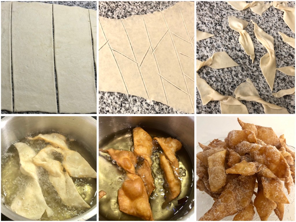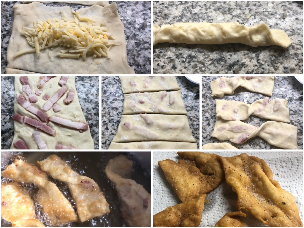 - Lazos de beicon, mantener la masa del mismo grosor, poner beicon encima, tapar con más masa, estirar un poco, cortar en rectángulos, girar del centro y freír.
