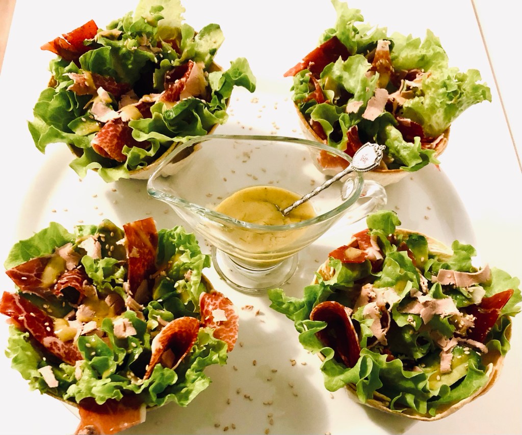 - 4 tortas de maíz grandes, tostadas en airfryer 2 o 3 min a 200º dándoles forma de cuenco. (Dentro de ellas se montan y presentan las ensaladas).
