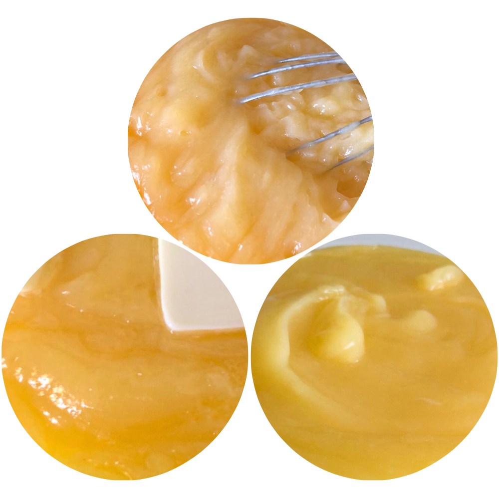 - Batir todo junto, llevar al microondas 2 o 3 min., según potencia, hasta que cuaje, sacar, echarle 40 g de mantequilla, batir hasta obtener una crema fina suave. Ponerla en una manga pastelera, llevarla al frío hasta necesitarla.
