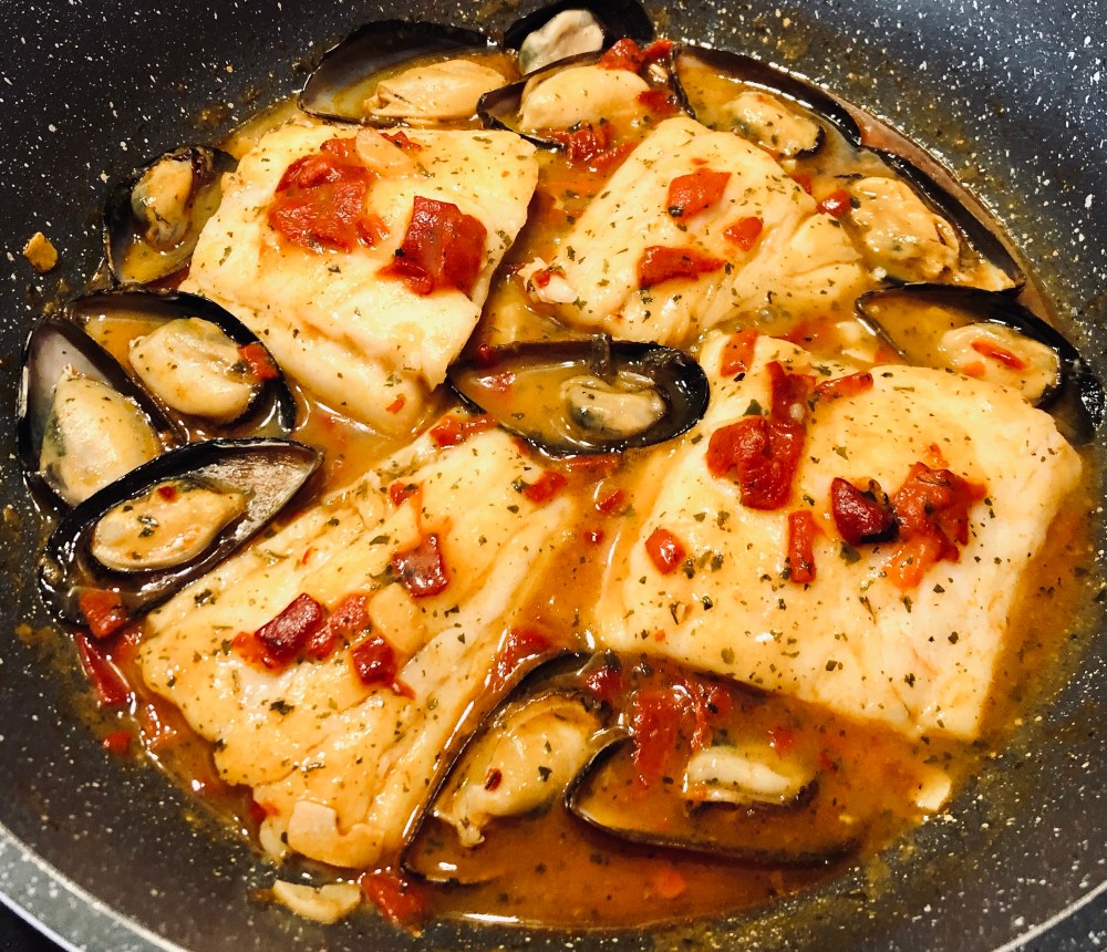 - Colocar los trozos de bacalao con la piel hacia abajo. Añadir el perejil picado por encima y el resto del agua hasta casi cubrir. Cuando empiecen a hervir, agarrar la sartén por el mango y moverla en círculos para ligar la salsa, colocar los mejillones alrededor. Tapar y dejar cocer a fuego medio-bajo 10 minutos aproximadamente.