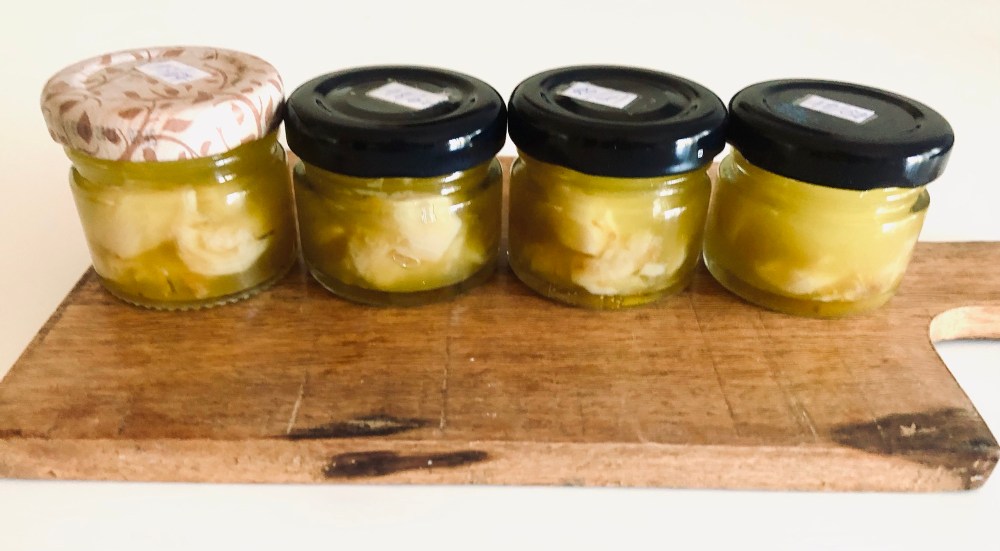 Ajos confitados partidos por la mitad, retirándoles el tallo central y hechos con pétalos de flores de aciano y caléndula. El resultado es muy interesante; quedan suaves, con un toque aromático, sutil al paladar y no repiten al consumirlos.