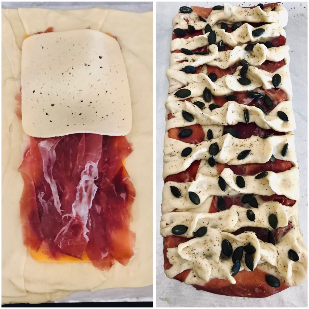 - Espolvorear por encima con hierbas provenzales molidas, poner un poco de sal, las pipas de calabaza y barnizar con cuidado con el huevo con nata, ( este paso se puede hacer al principio, nada más sellar las tiras).