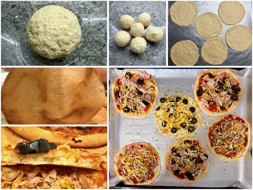 Esta masa con levadura química es la solución perfecta cuando se quiere improvisar una cena divertida o un picoteo rápido. La masa estará lista en cinco minutos, sin esperas, y quedan blanditas y nada pegajosas, por el toque de aceite de oliva. Mientras se preparan, ir precalentando el horno a 200º por aire o arriba y abajo. Se pueden rellenar al gusto con los ingredientes que se tengan en casa en el momento de hacerlas.