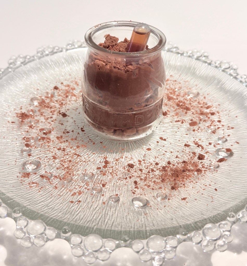 Un mousse suave, aromatizado con un sutil mix de especias y presentado en tarritos de cristal con una pipeta de brandy flambeado, tú eliges si lo deseas perfumar o no hacerlo.