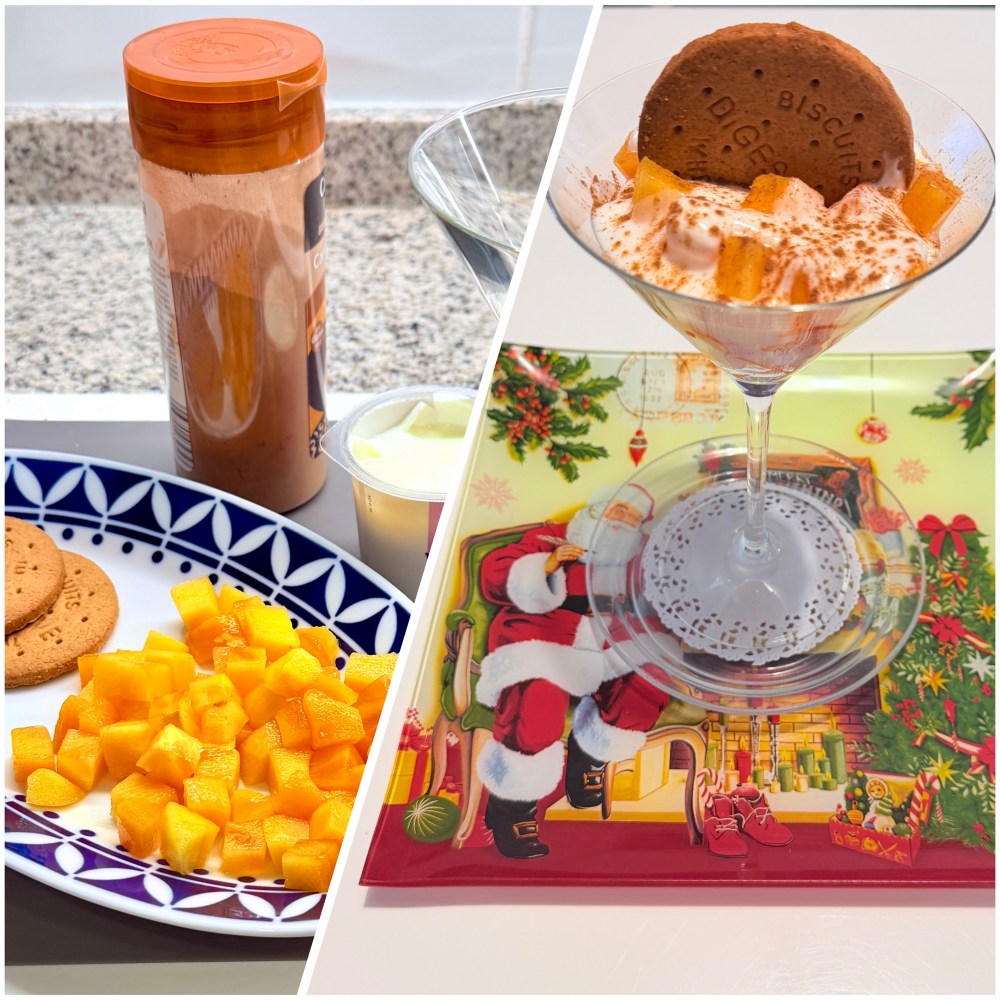- Terminar colocando algunos cubos de kaki, espolvorearlo con canela. A la hora de presentar, colocar la galleta en el centro.