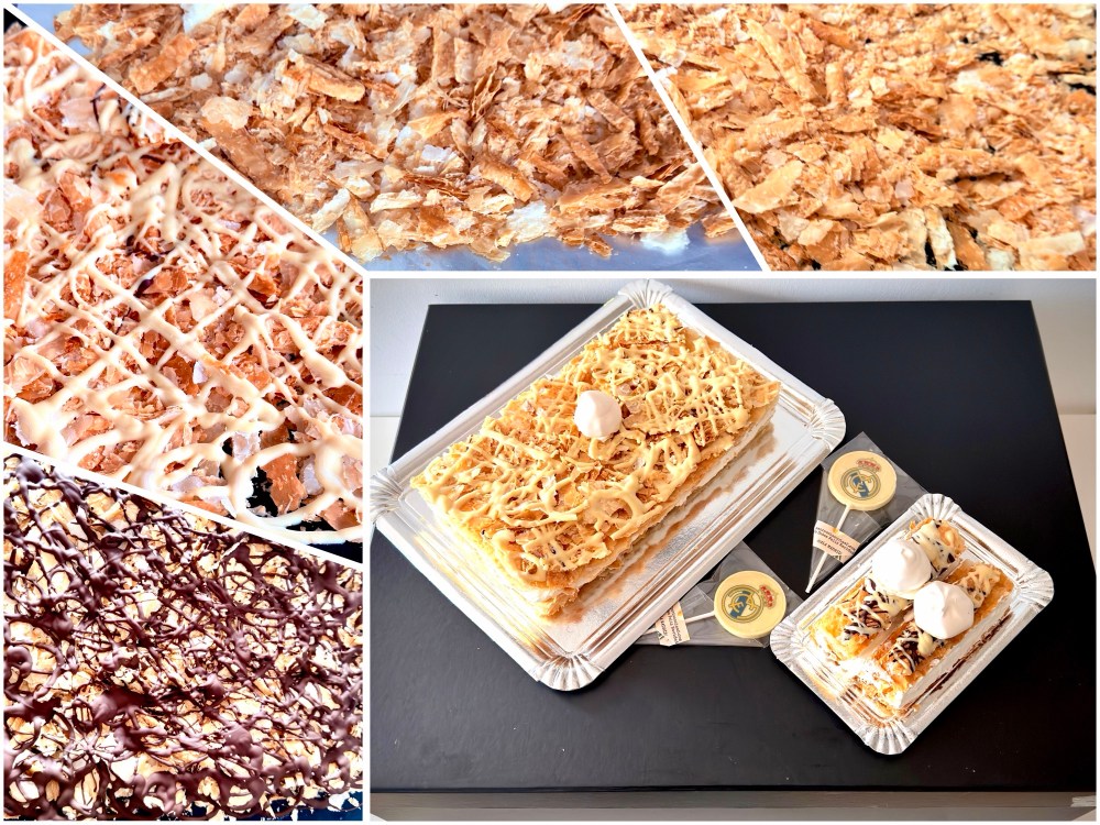Como fui muy previsora, horneé una placa de hojaldre de más por si alguna se rompía durante el montaje. Al final no hizo falta usarla y, además, al ajustar la tarta, hubo que recortar los laterales de los hojaldres.