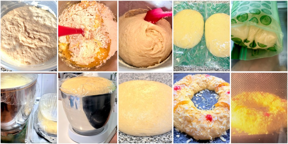 - Dividir la masa en porciones, bolear cada roscones y darles forma: 2ª fermentación: una vez formados dejar hasta que doblen volumen a temperatura ambiente, si se van a hornear el mismo día.